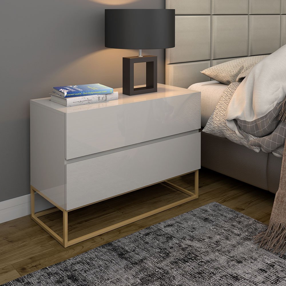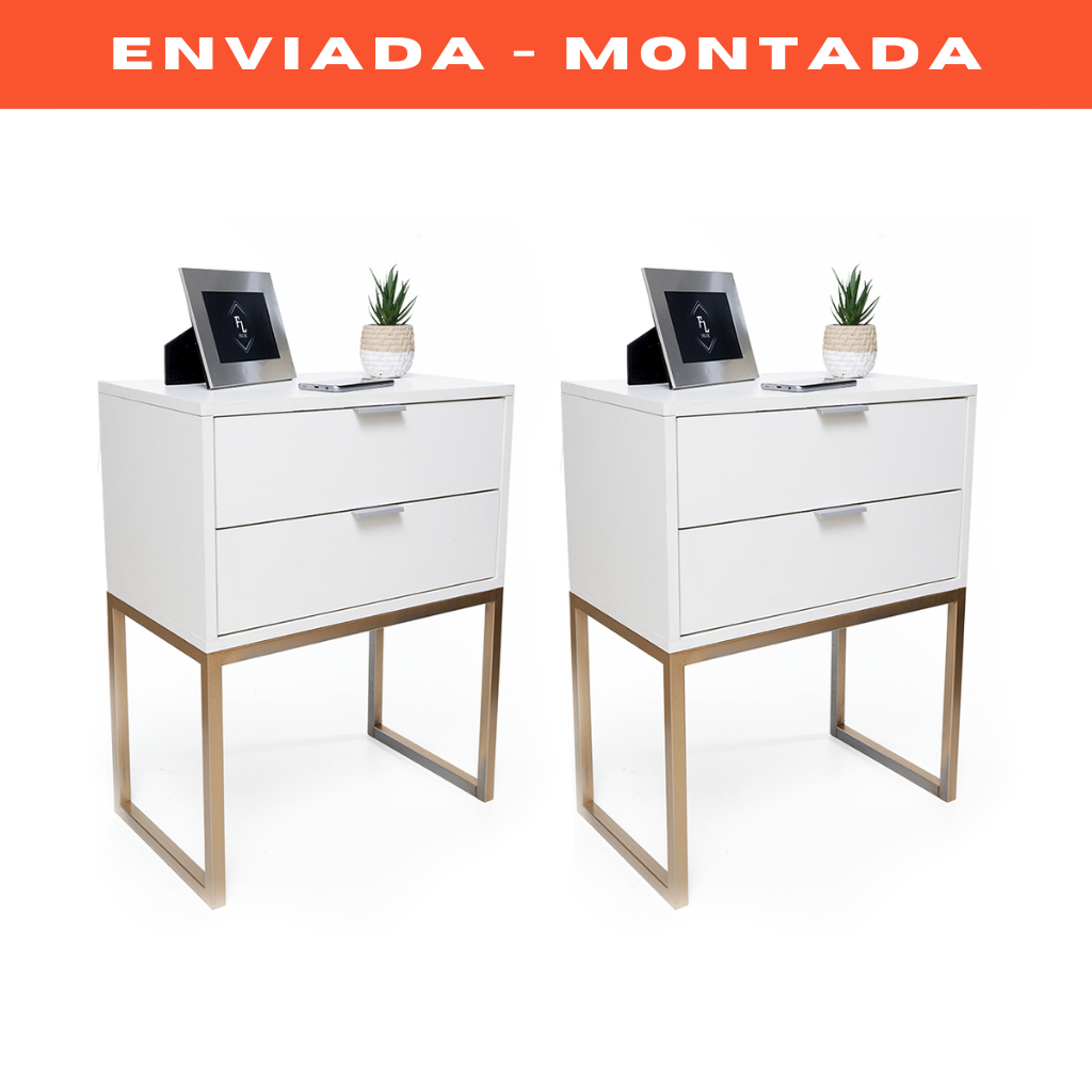 Kit Mesa De Cabeceira Branca Industrial Eco 40cm 2 Gavetas Base Dourado Já Montado