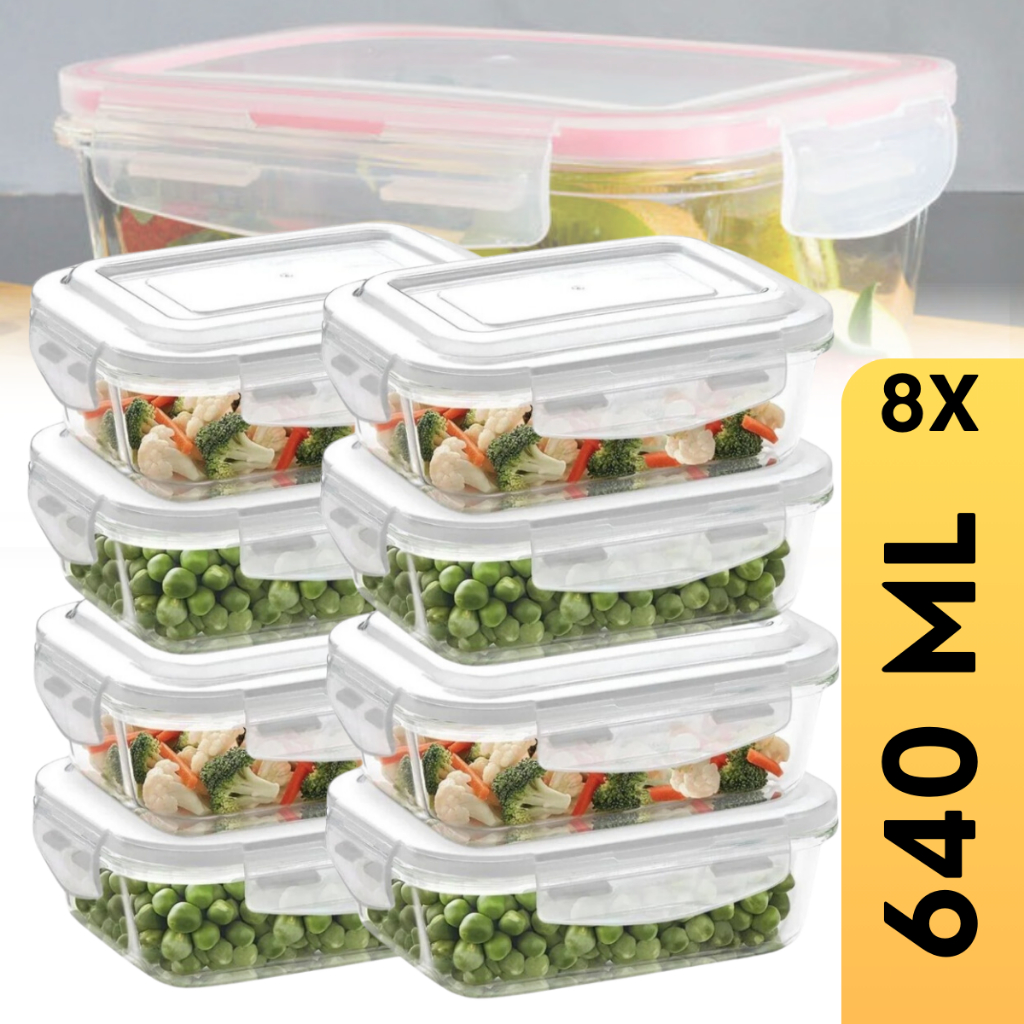Kit 8 Potes de Vidro Hermético com Tampa 640 ml Multiuso para Freezer Forno Micro-ondas Geladeira