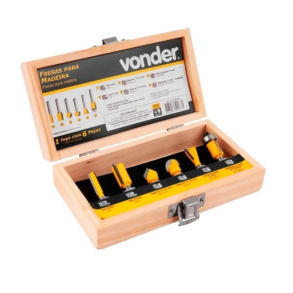 Kit Jogo de Fresas para Tupia Vonder 12mm 6 Peças c/ Maleta de Madeira