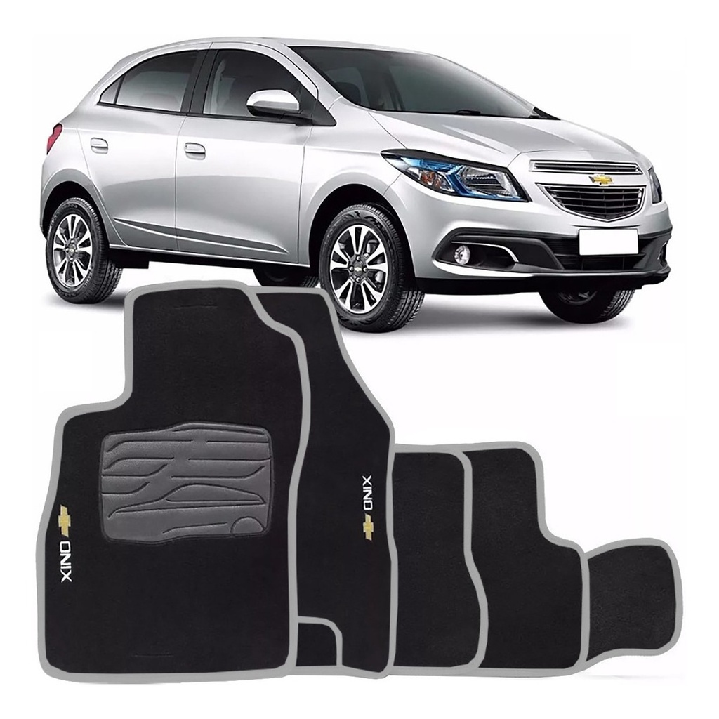 Jogo Tapete Carpete Gm Onix 2012 2013 2014 2015 2016 2017 2018 Acabamento Cinza com Logo Bordado
