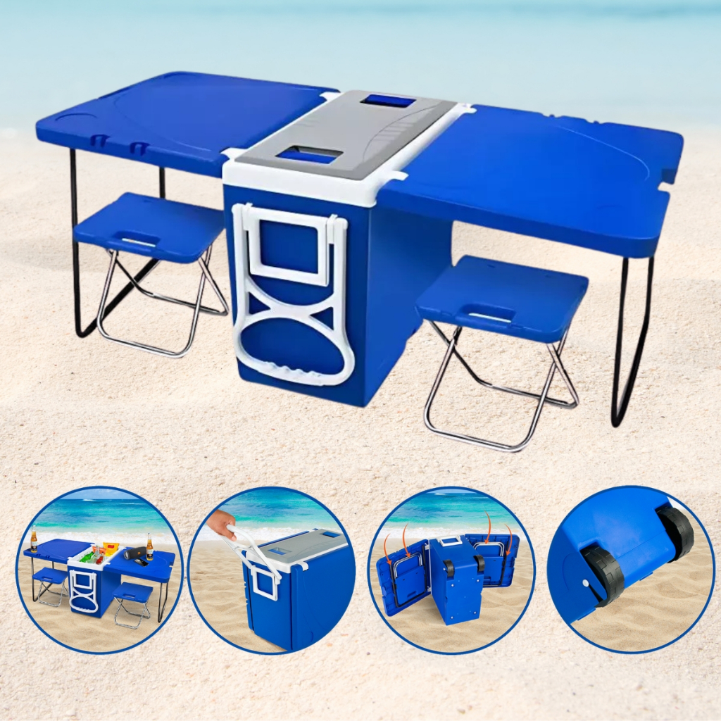 Super Caixa Térmica Multifuncional Com Rodinha 5 em 1 Mesa com Cadeira Praia Camping 32 Litros