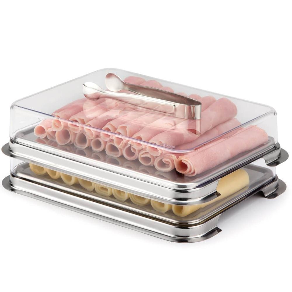 Porta Frios Duplo Inox Empilhável Com Pegador Pinça Kit Casa Presunto Queijo Cozinha