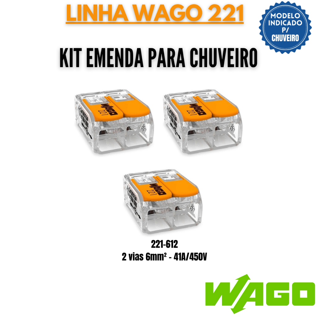 Kit 3 Peças Conector Wago Original 221-612 Emenda Chuveiro 2 polos 6mm 41A Conexão Automática