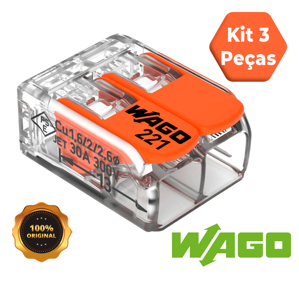 Kit 3 Conectores Emenda Para Fios Elétrico Chuveiro 3 Polos Flexível 0,5 – 6,0 mm² 41A Wago Isola Compacto 221-613