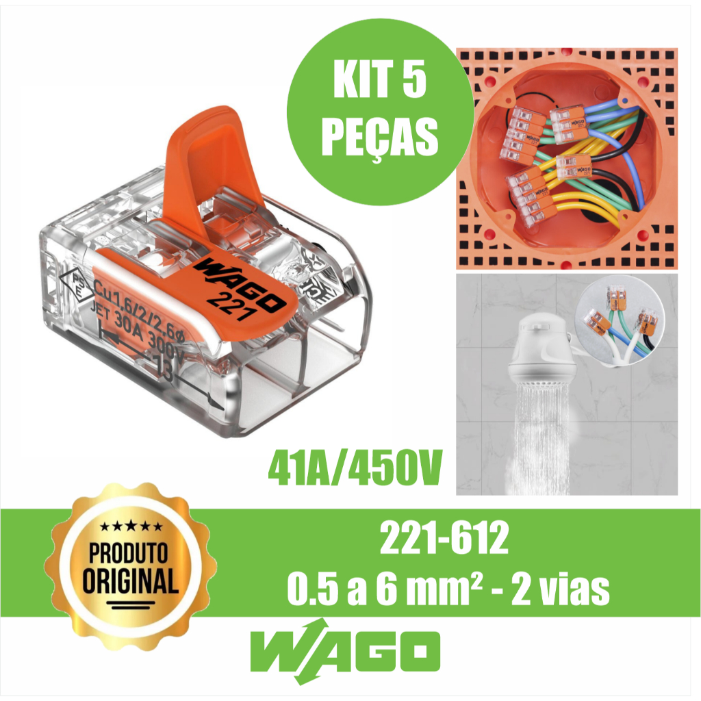 Kit 3, 5, 10 e 20 Conector Elétrico 221-612 Emenda Wago 2 Vias 41A Original 6mm² Fio Chuveiro Tomada