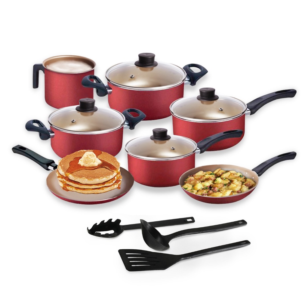 Jogo de Panelas 10 Peças Cereja Antiaderente com Tampa de Vidro e Utensílios