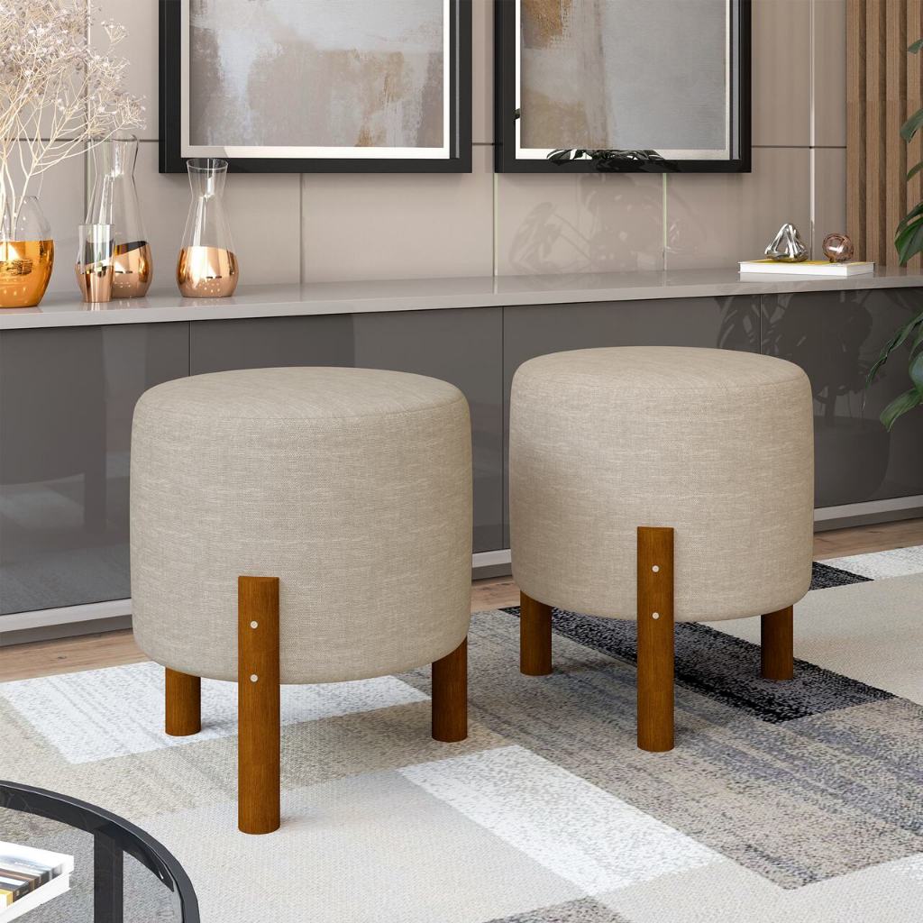 Kit 2 Puff Banqueta Banquinho Redondo Em Linho Bege Thor Luxo Pés de Madeira