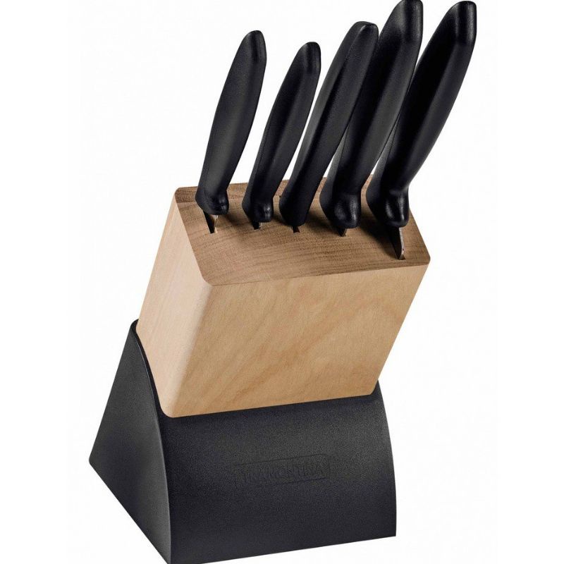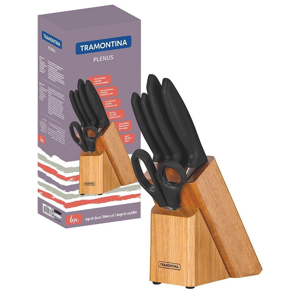 Jogo de Facas Tramontina Plenus Inox Cabos Polipropileno Preto e Suporte de Madeira 6 Peças 23498015