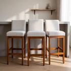 Kit 3 Banquetas Altas Estofada Encosto Tecido Linho Madeira Maciça Eucalipto para Cozinha Bistrô Bancada Gourmet Americana
