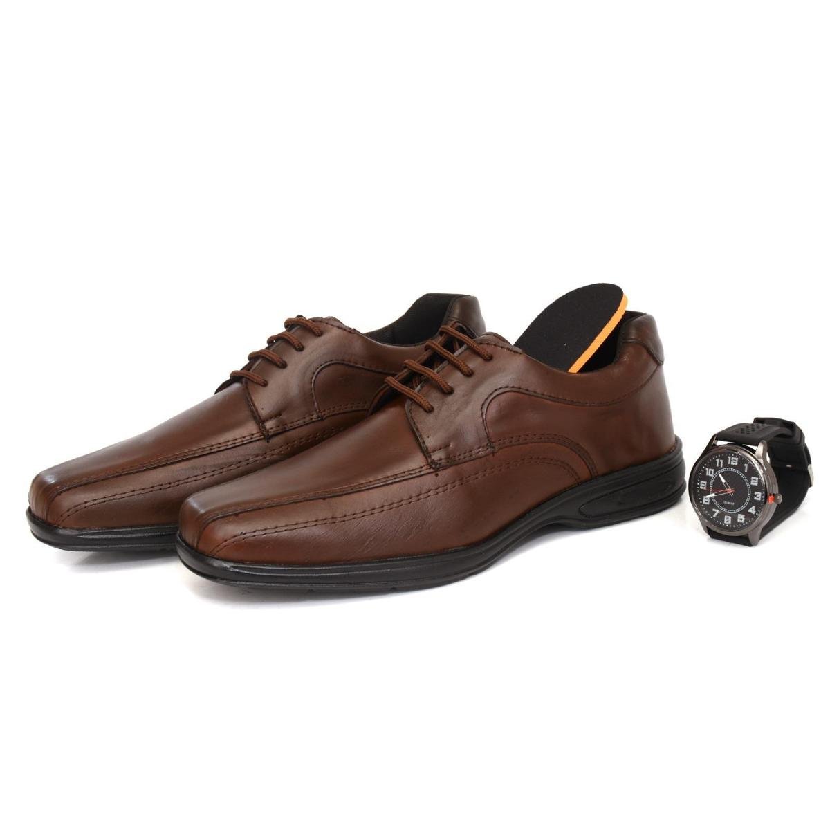Sapato Social Couro Legitimo Masculino Oxford Casual Cadarço Palmilha Gel + Relógio Analógico
