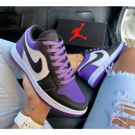 Tênis Bota NK Air Jordan 1 High Cano Alto Feminino Masculino Preto/Roxo/Branco Sola Reta