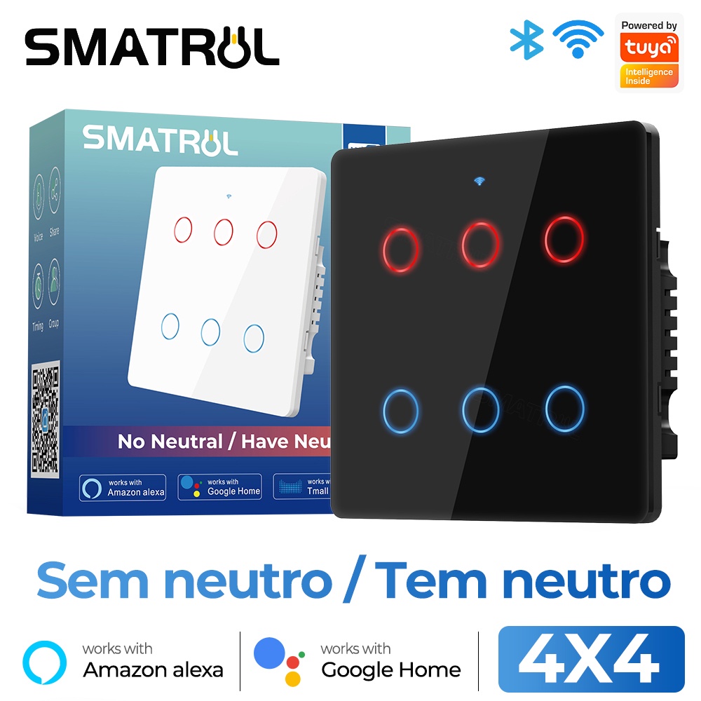 SMATRUL No Neutral Wire Brasil 4x4 Tuya WiFi Interruptor De Luz Inteligente 6 Gangues Touch Wall 110-240V Painel De Tela APP Trabalho De Voz Com Alexa Google Home