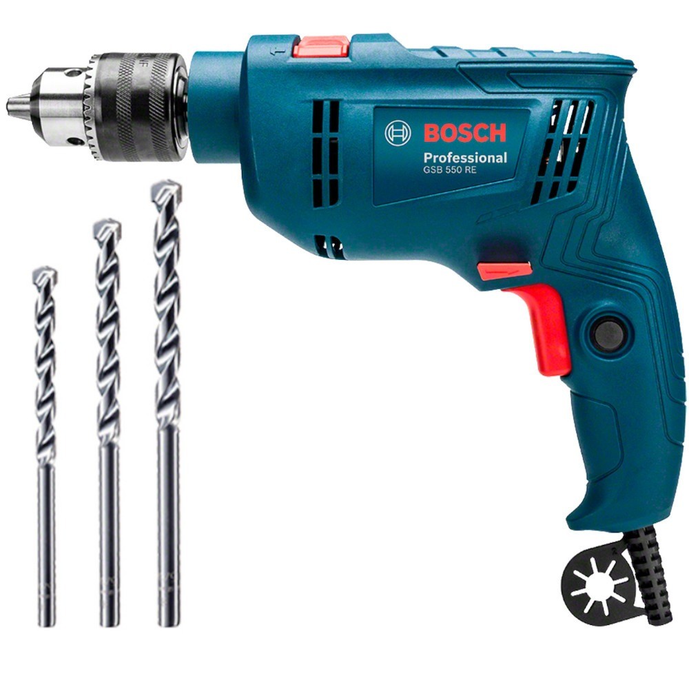 Furadeira de impacto 1/2" 550 Watts velocidade variável reversível com 3 brocas - GSB 550 RE Bosch