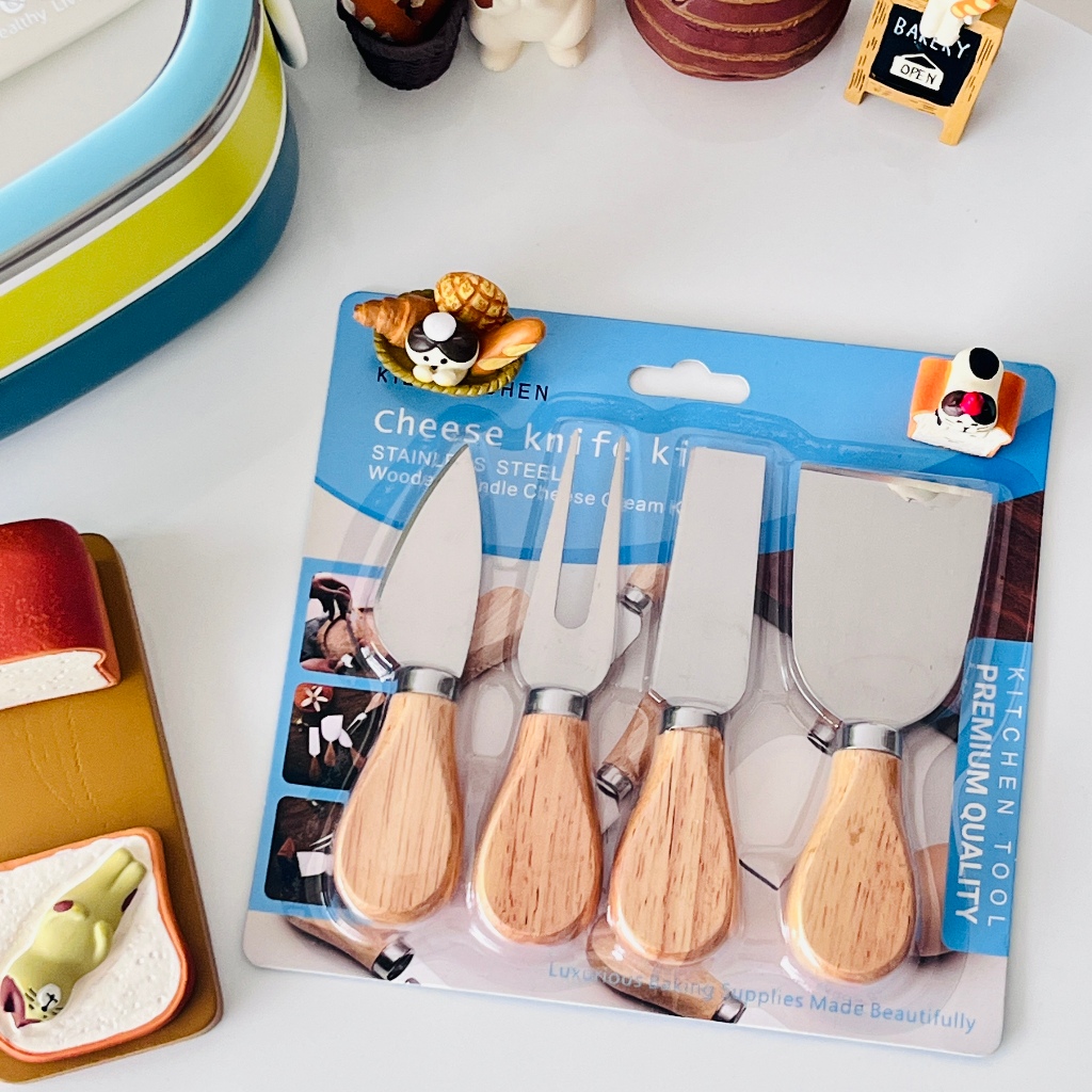 Conjunto Kit Para Cortar e Servir Queijo 4 Peças Aço Inox Com Cabo De Madeira