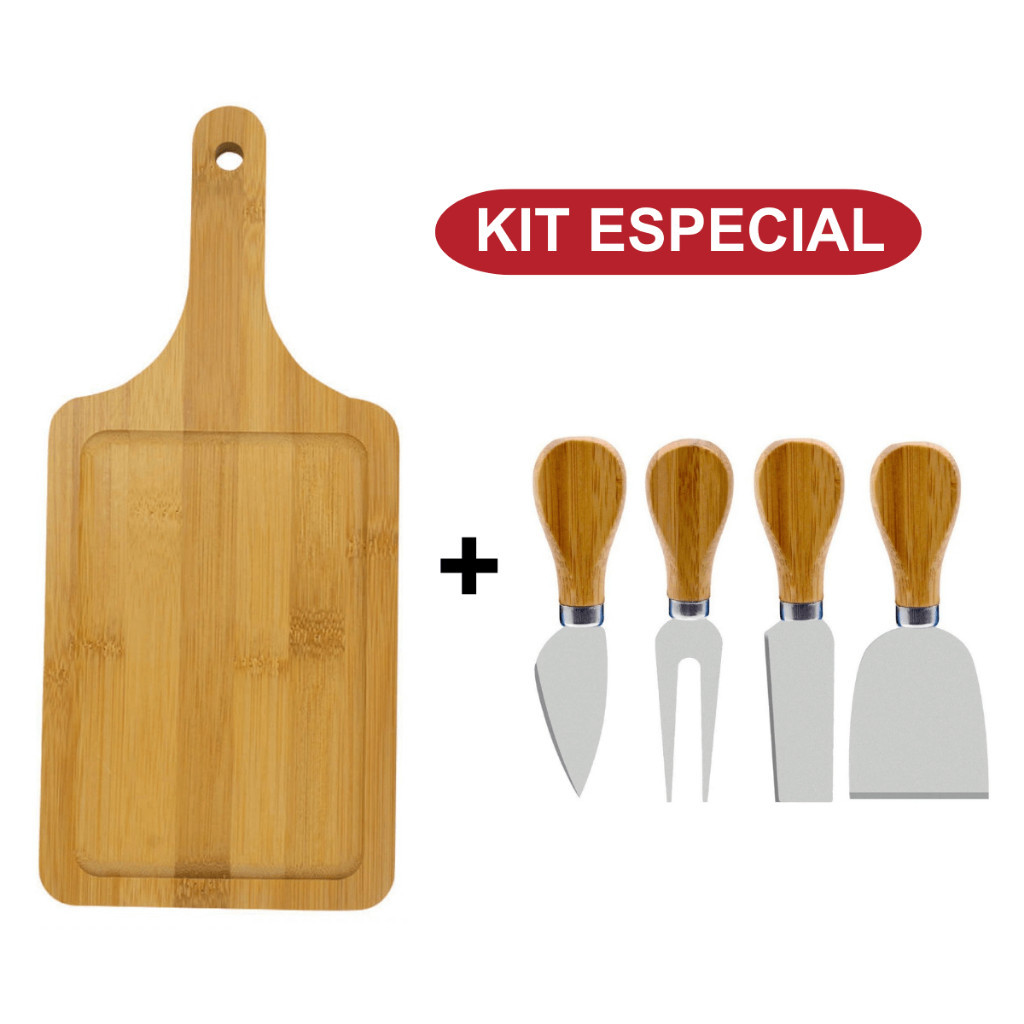 Kit Tabua 34x14cm Bambu com Conjunto 4 Peças Inox para Queijo servir Petiscos Aperitivos Churrasco