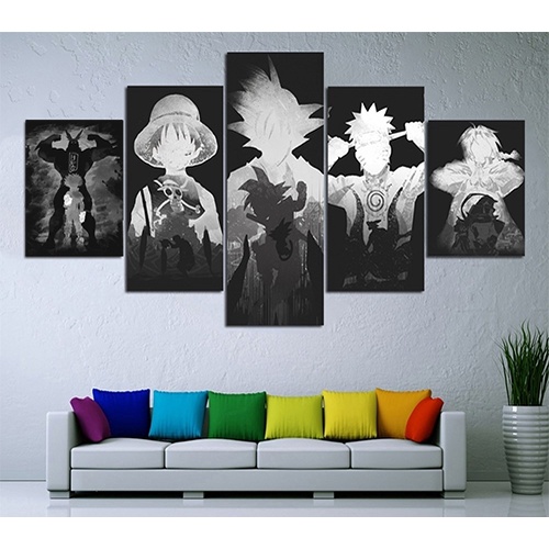 Quadro Decorativo 5 peças Mosaico Animes Meliodas Goku Boku no Hero Punch Man Nanatsu One Piece Luffy Dragon Ball Super Preto