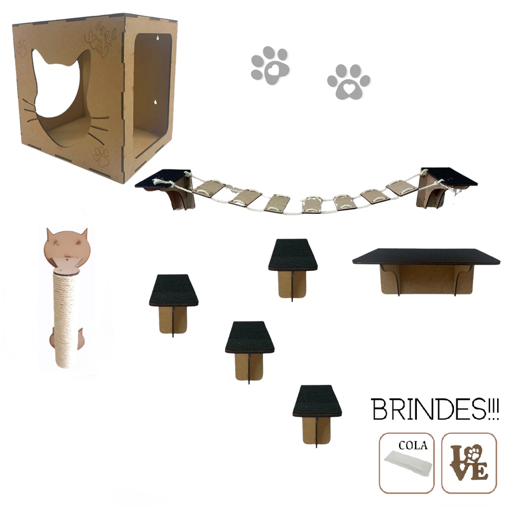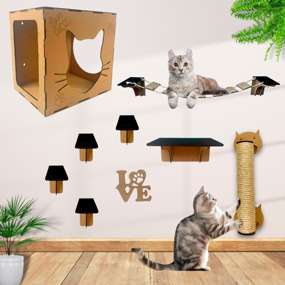 Kit Playground Para Gato 9 peças Degraus Nicho Arranhador Ponte Em MDF