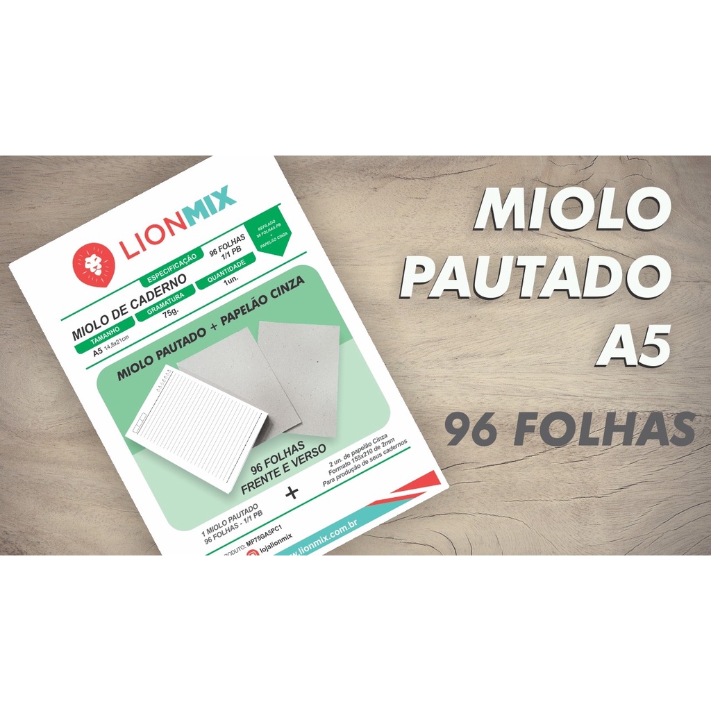 MIOLO DE CADERNO PAUTADO A5 + PAPELÃO CINZA 96 FOLHAS - OFFSET 75G. 1/1 PB - EMBALAGEM UNITÁRIA