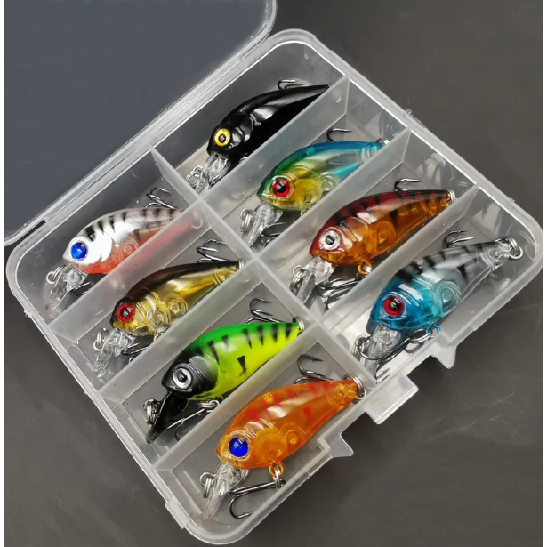 KIT COM 8 ISCAS + ESTOJO - ISCA ARTIFICIAL MEIA ÁGUA 4.5CM 3.5G PARA TUCUNARÉ/TRAÍRA/DOURADO / CACHORRA / PIRARUCU
