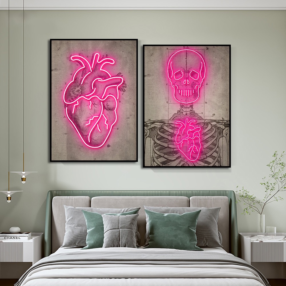Quadro decorativo 2 peças 40x60 moderno abstrato rosa neon esqueleto coração decoração para casa sala quarto hall