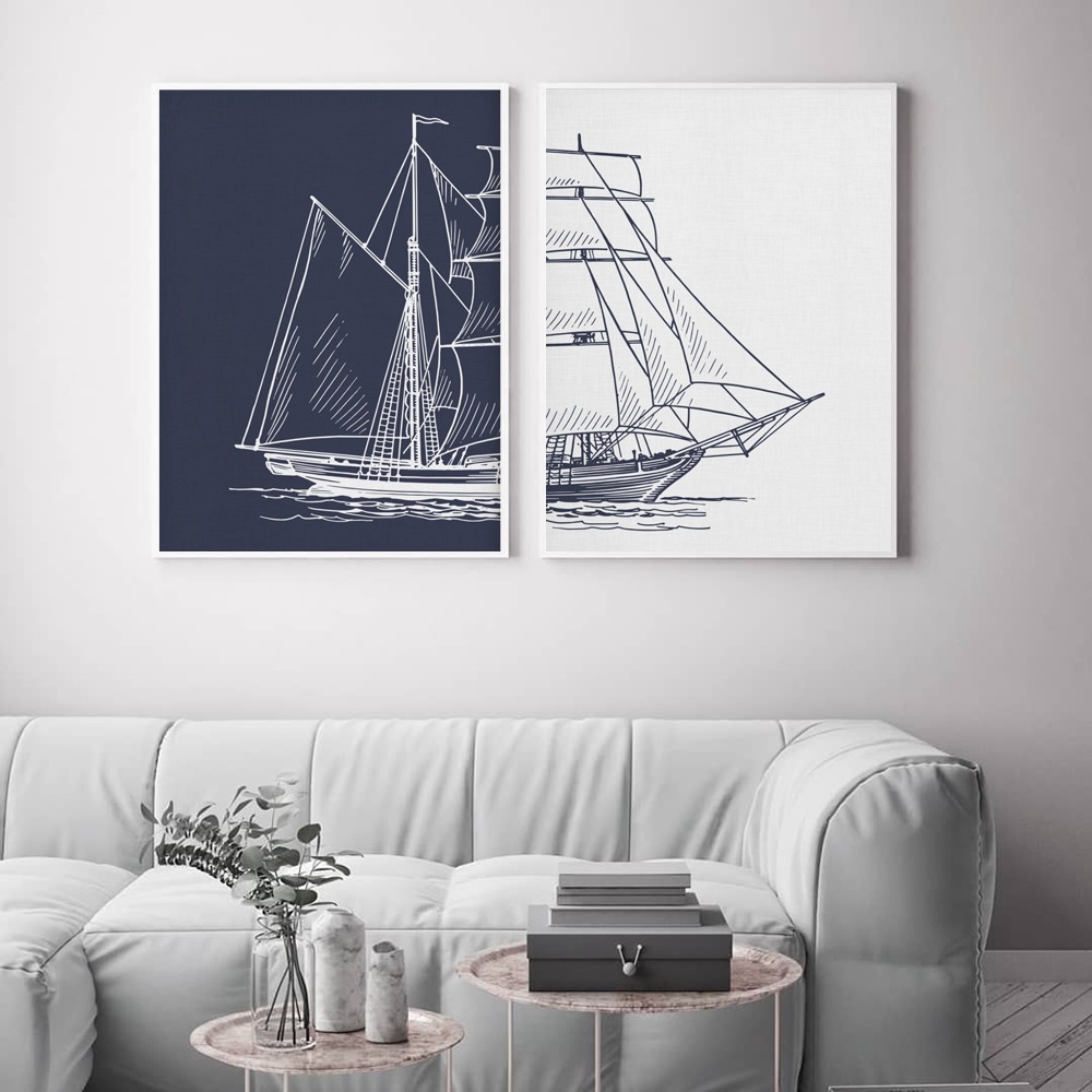 Quadro decorativo 2 peças 40x60 nórdico náutico barco navio azul branco simples moderno abstrato para sala quarto