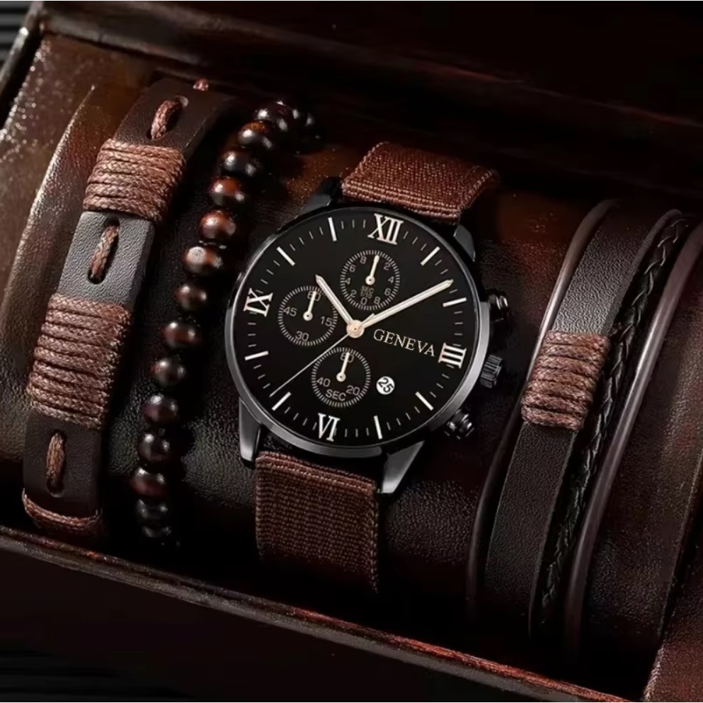 Relógio De Pulso Com Pulseira de Couro Sintético Moda Masculino Feminino Quartzo + Kit Pulseiras