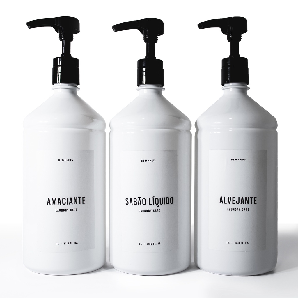Kit 3 frascos brancos lavanderia sabão líquido/ alvejante/ amaciante 1 litro