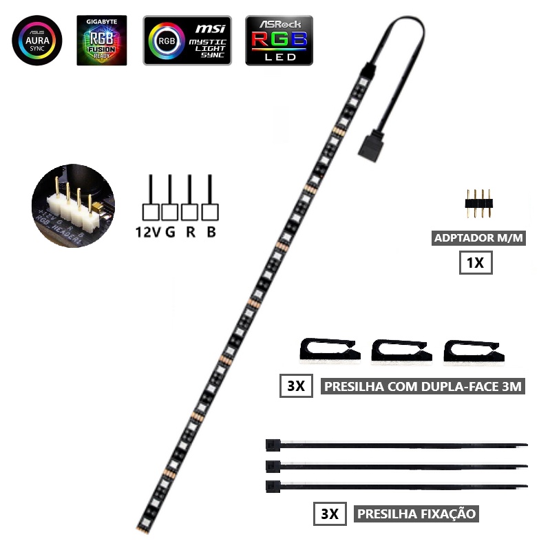 Fita de LED CPU Gabinete RGB 4 Pinos 12V Controlável 500mm