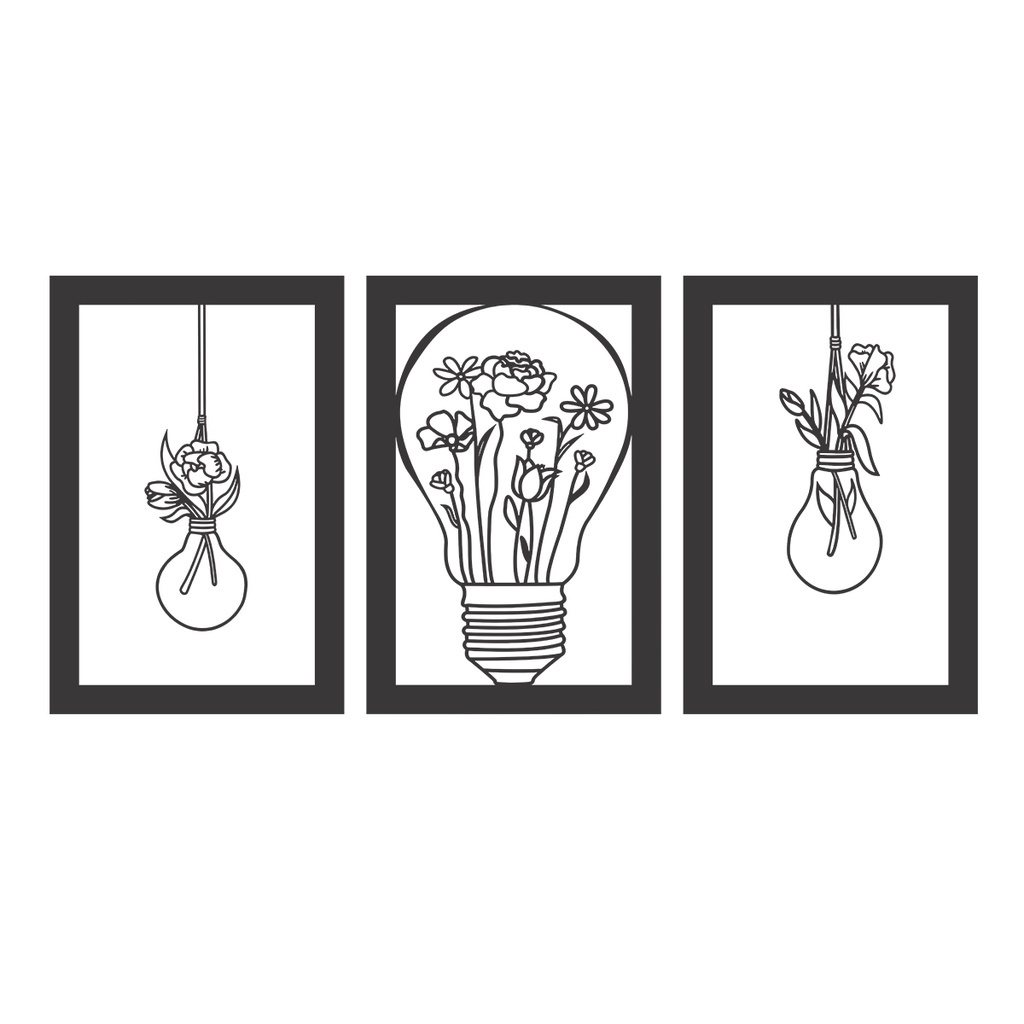 Quadro Decorativo Lâmpadas Florais 3 Peças C/ Dupla Face 3M em MDF Vazado de 3mm Preto