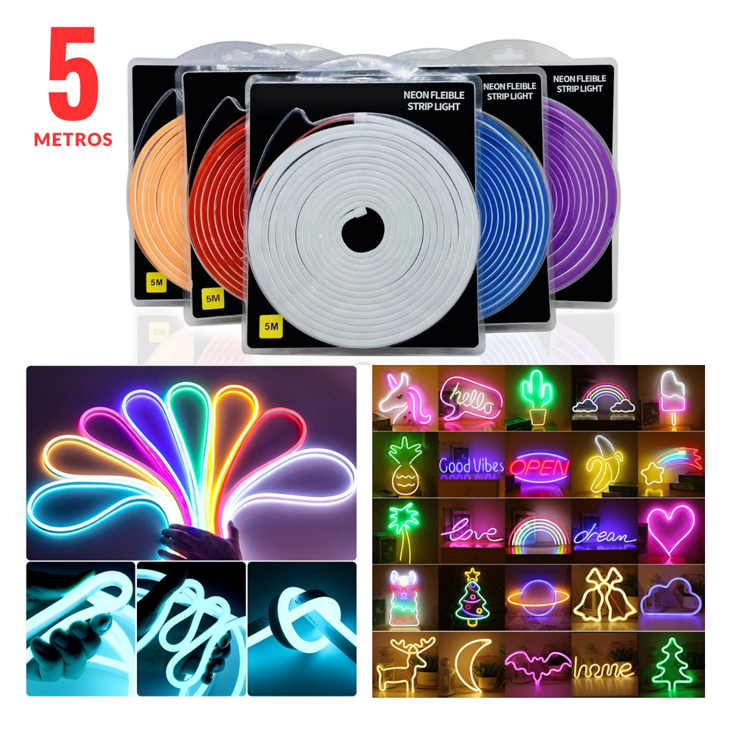 KIT Fita 5 metros Led Neon Silicone Corte 2,5cm Flex 12v Alto Brilho Varias Cores + fonte 5A