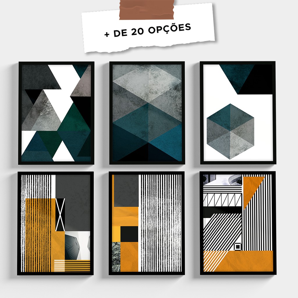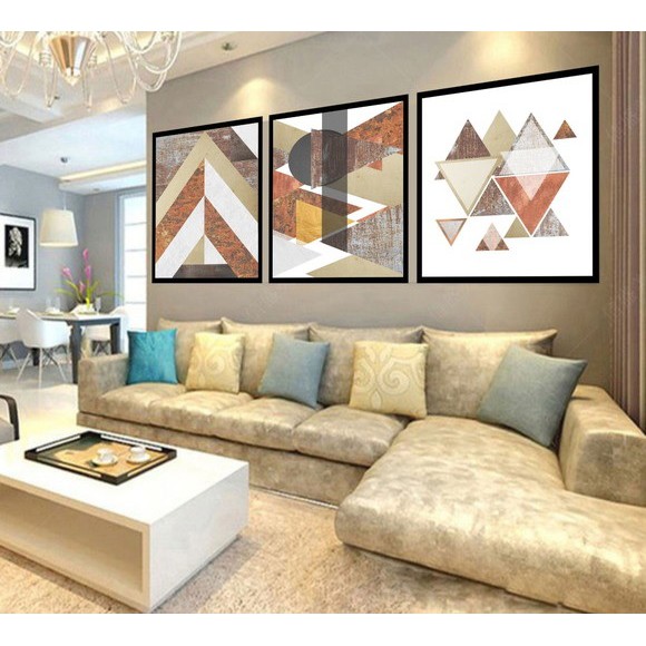 Conjunto 3 Quadros Decorativos Grande Com Moldura e Vidro Geométrico Abstrato Sala Quarto