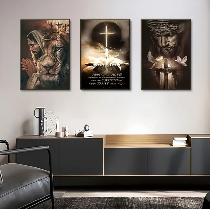 Quadros decorativos Grande180x60cm Conjunto de 3 telas de arte religiosa - Decoração de parede cristã moderna, Cruz de Jesus e Leão,