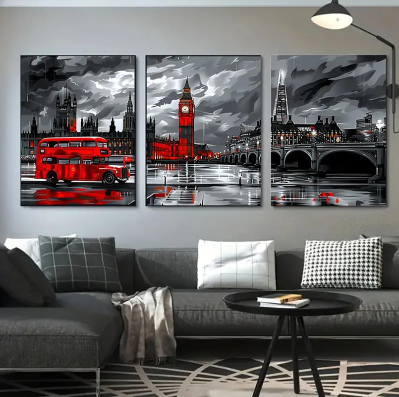 Quadros decorativos Grande180x60cm Conjunto de Arte de Parede Urbana Vintage em Canvas - Conjunto de 3 Peças Retangulares sem Moldura com