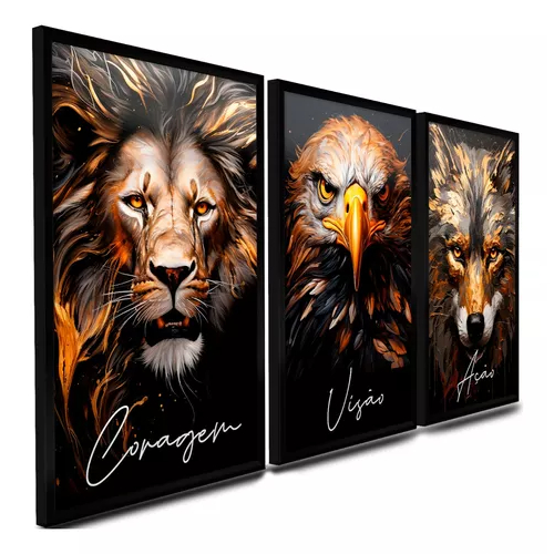 Quadros Decorativos 3 Peças Conjunto Motivacional Leão Lobo Águia Dourado Gold Coragem Visão Ação Para Escritório Empreendedorismo Casa Sala Quarto Parede