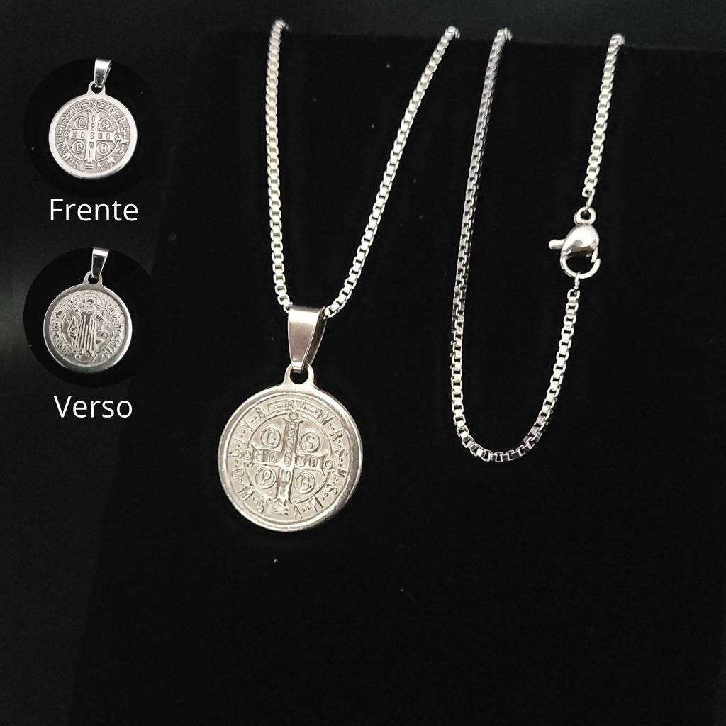 Colar Corrente Veneziana Com Pingente Medalha de São Bento Dupla Face de Aço Inoxidável 316L