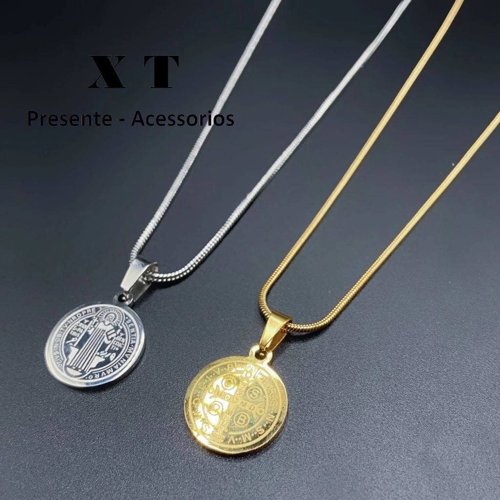 Colar Aço inoxidável com Pingente Medalha de São Bento Banhado a Ouro 18K / Aço Cirúrgico