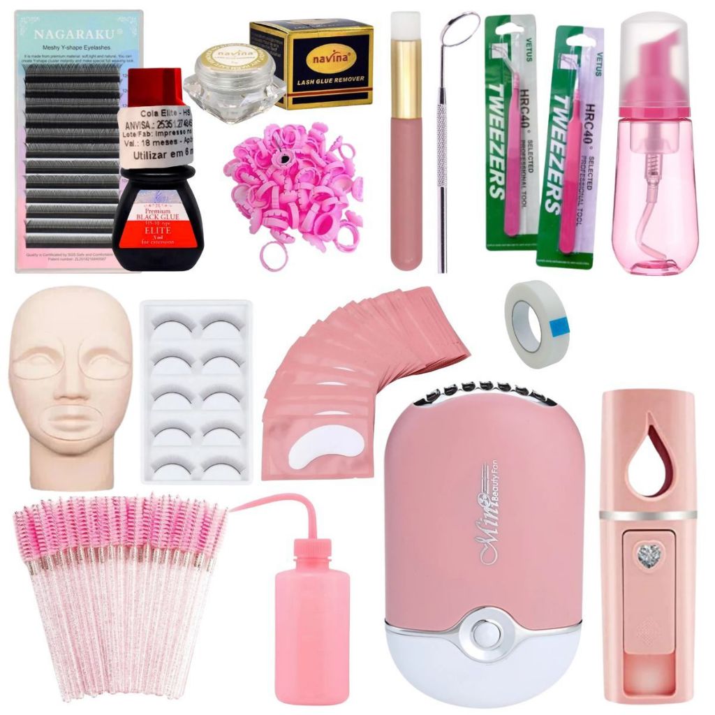 Kit Completo Treino Extensão Cílios Nagaraku Fio a Fio Y Volume Brasileiro Cola Elite HS10 3ML Removedor e Espuma Navina Ventilador Cabeça Boneca Treino Ventilador e Nano Mister USB Escovinha e Microbrush