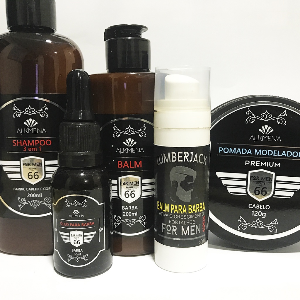 Kit Shampoo, Balm, Óleo para Barba, Pomada Translucida e Ativador de Crescimento para barba - Alkmena (Presenteável)
