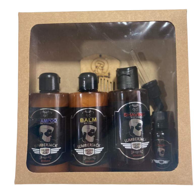 Kit Balm, Shampoo 3x1, Shaving e Óleo para barba Lumberjack e Pente de Madeira para barba - Alkmena