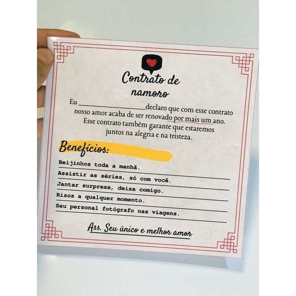Contrato de namoro A4 , dia dos namorados, aniversário de namoro, presente, surpresa romântica.