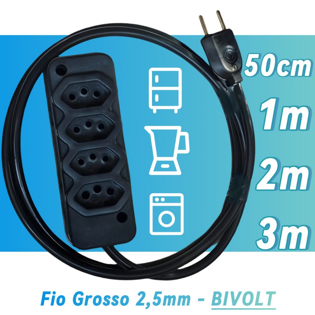 Extensão elétrica Extensão de Energia 4 Tomadas com 50 cm 1 metro 2 metros 3 metros Preta 20 Ampares