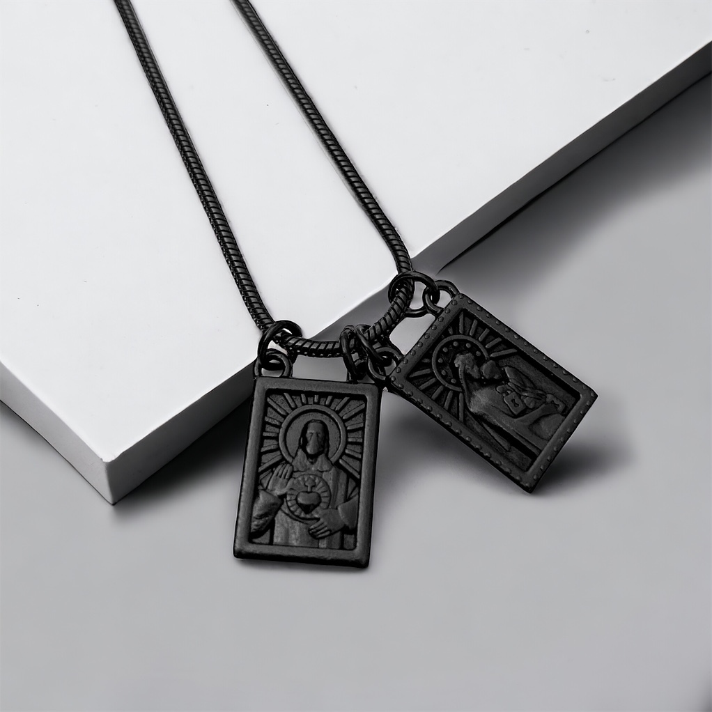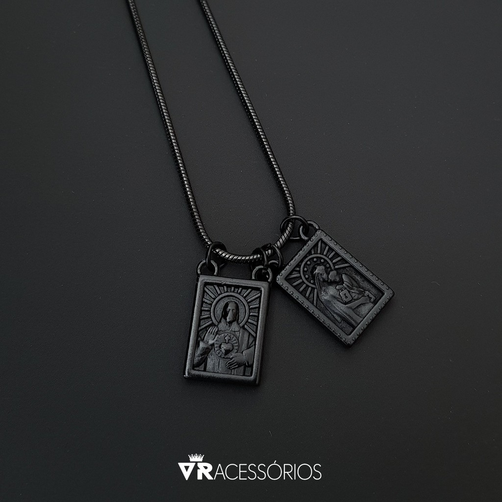 Escapulário Masculino Preto/Corrente Aço Inoxidável 316L/Cordão masculino artesanal/Sagrado Coração de Jesus e Nossa Senhora do Carmo