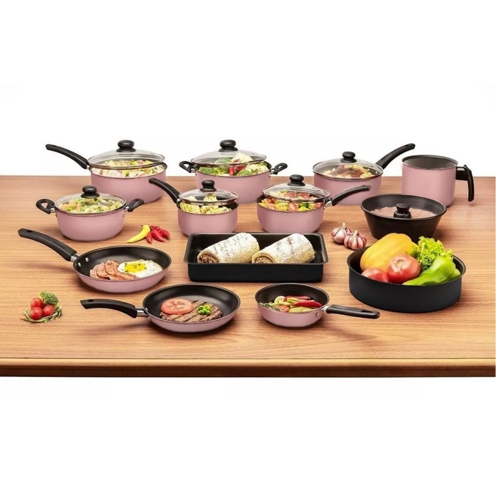Conjunto kit Jogo de panelas Rose 18 peças Antiaderente Teflon Com Tampa de Vidro utensílios Cozinha