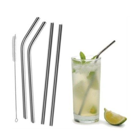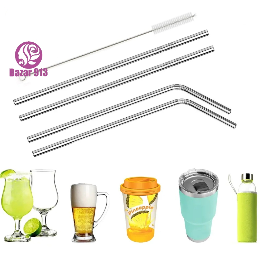 Kit 4 Canudos 2 Reto e 2 Curvo em Inox Reutilizável ecológicos com 1 limpador escovinha C&W BAZAR