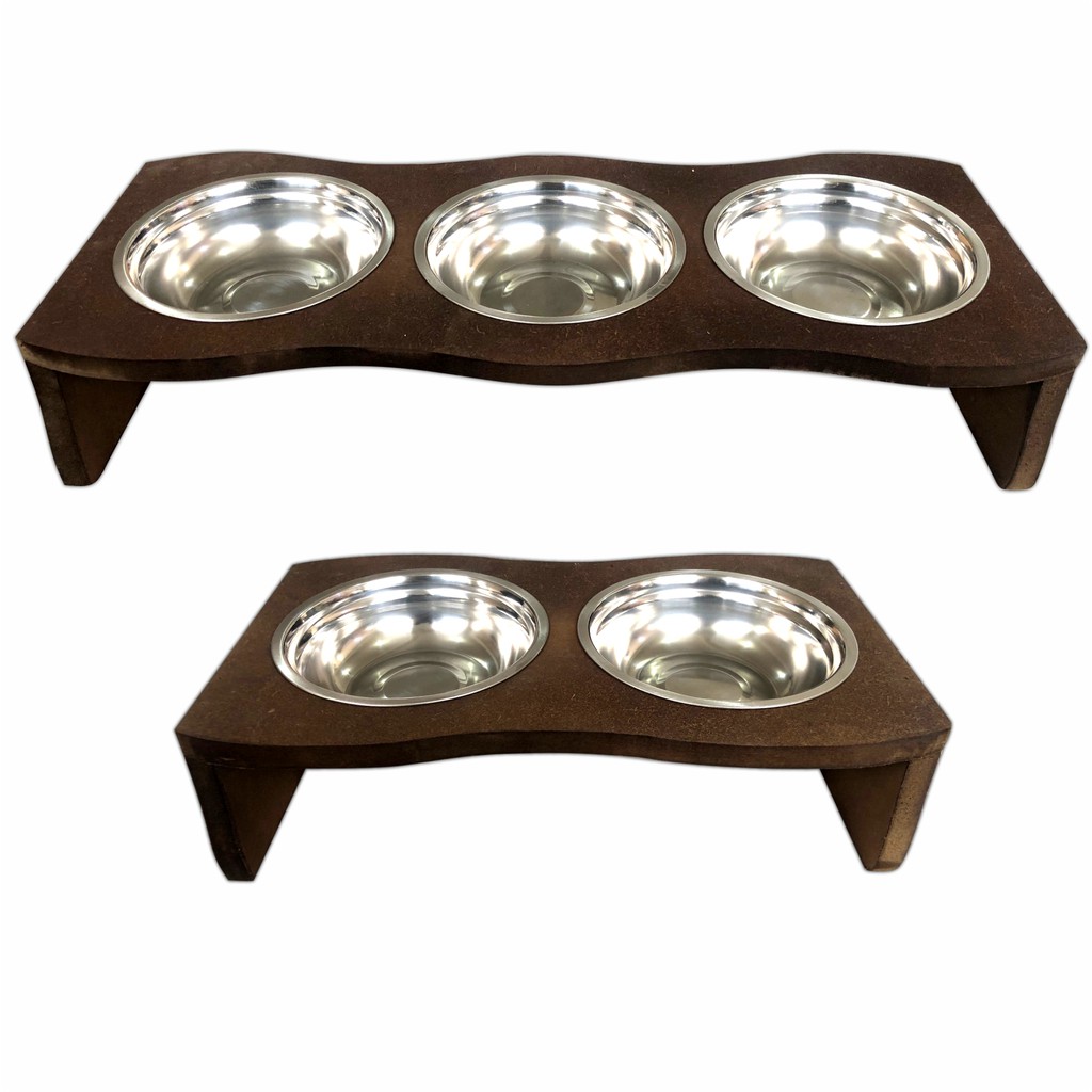 Kit Comedouro Madeira 3 E 2 Potes Em Inox Pet Cachorro Gato