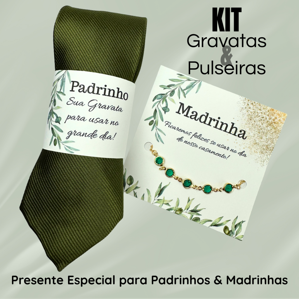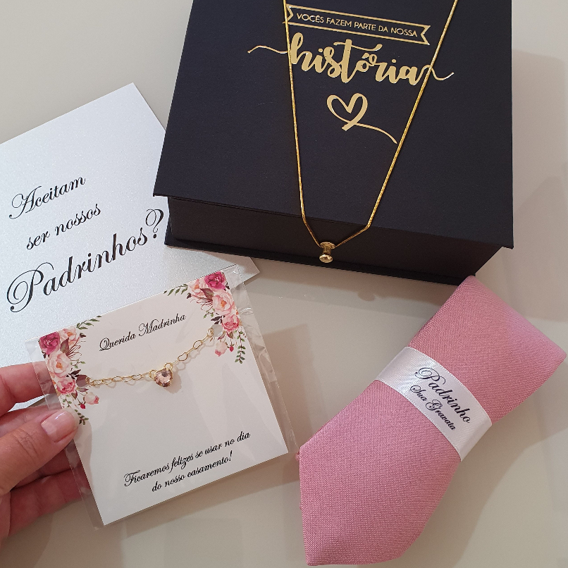 Kit Convite Casamento Padrinhos Madrinhas Presente Gravata Slim com Pulseira Folheada Ouro kit Pronto