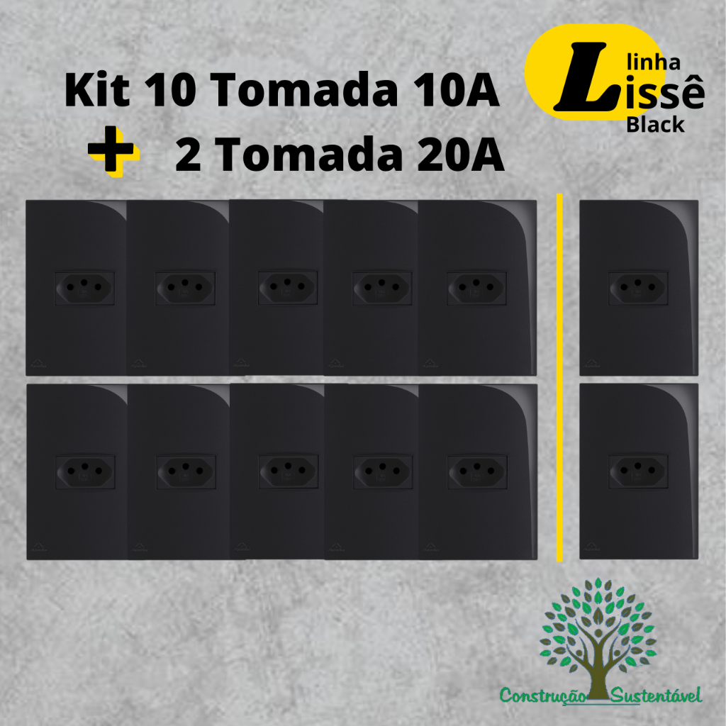 Kit 2 Tomadas 20A Horizontal + 10 Tomadas 10A Linha Lissê Black - Tomada Modular Preta Brilhante