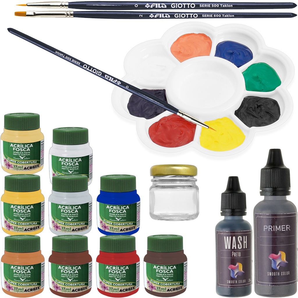 Kit de Pintura para Iniciantes c/ 17 tintas foscas, 6 tintas metálicas, 4 auxiliares, 3 pinceis