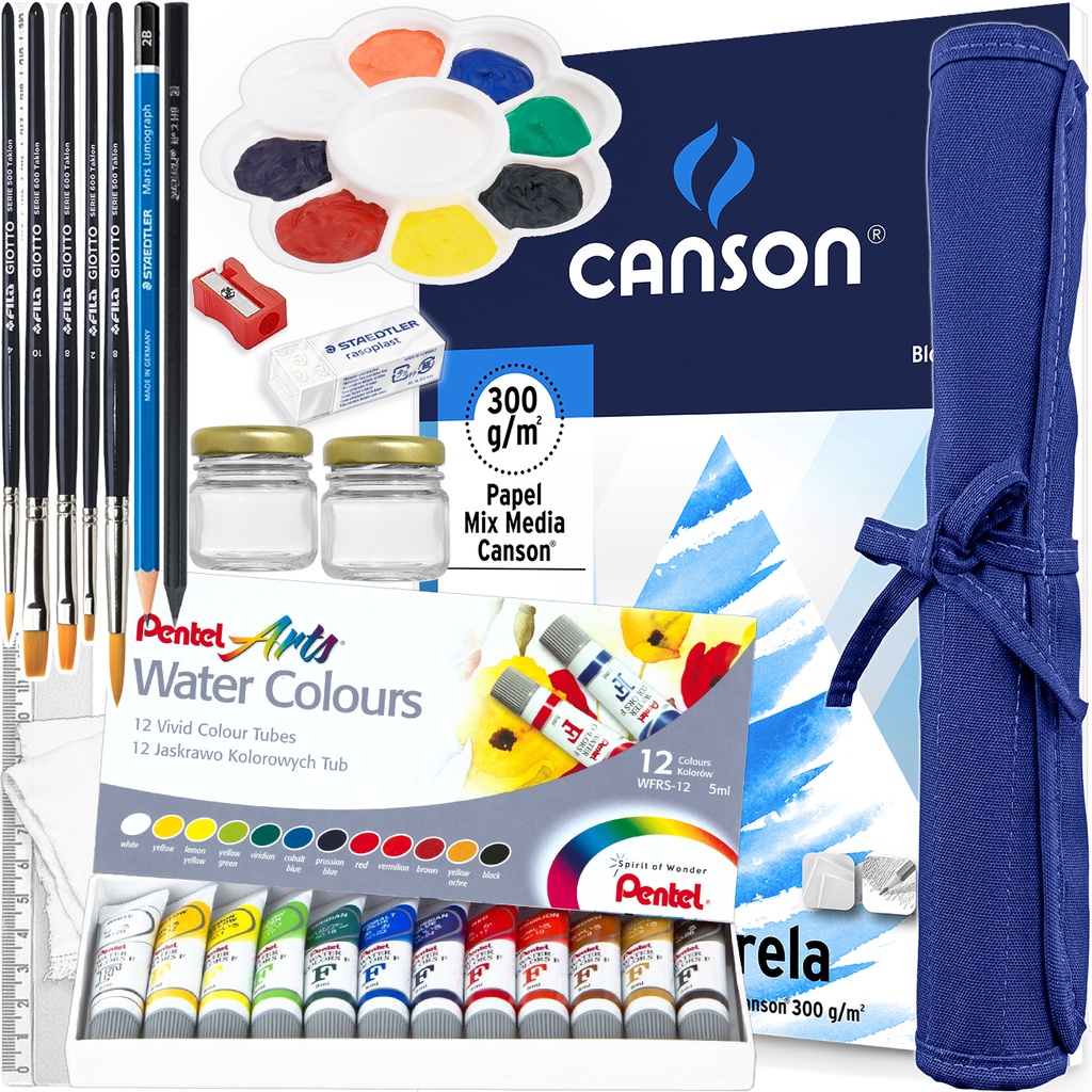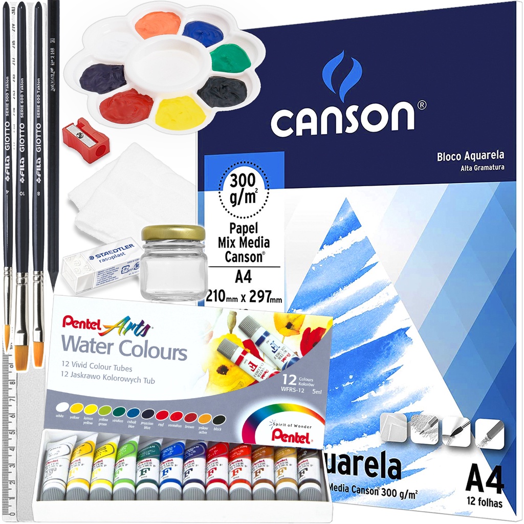 Kit Pintura Aquarela Pronto p/ Usar C/ 12 Tintas Pentel + Papel Canson + Lápis Staedtler + 6 Pincéis e Mt+