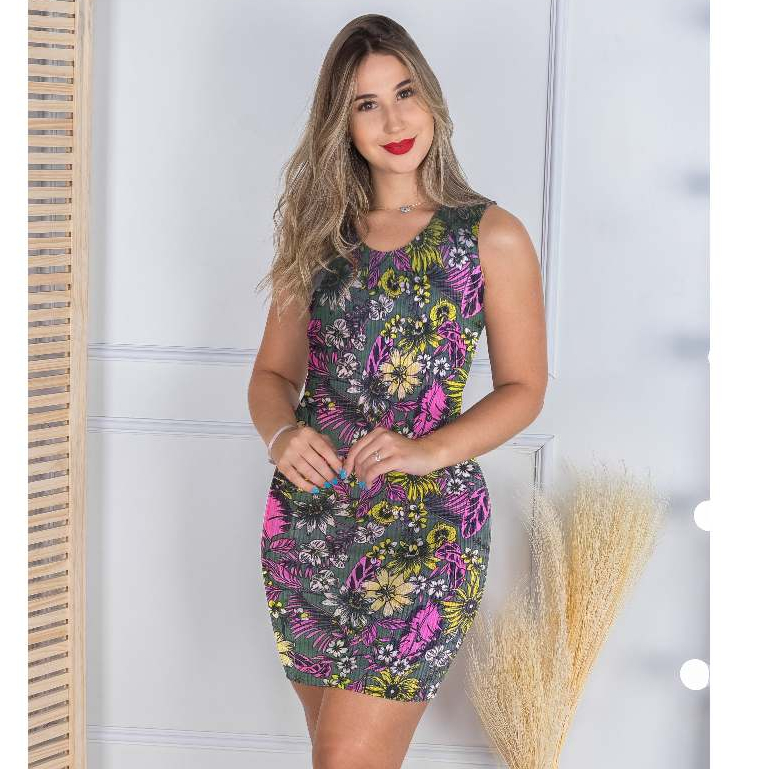 Vestido Curto Floral Canelado Moda Feminina Regata Verão Confortável Leve